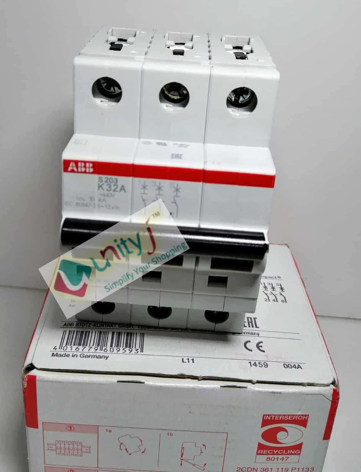 ABB Circuit Breaker System Pro M Compact S200 – 3P, 32A, Curve K, 440V AC, 20kA Breaking Capacity, DIN Rail Mounted, Ideal for Industrial/Residential Use, Motor Control, BS EN 60898 Compliant