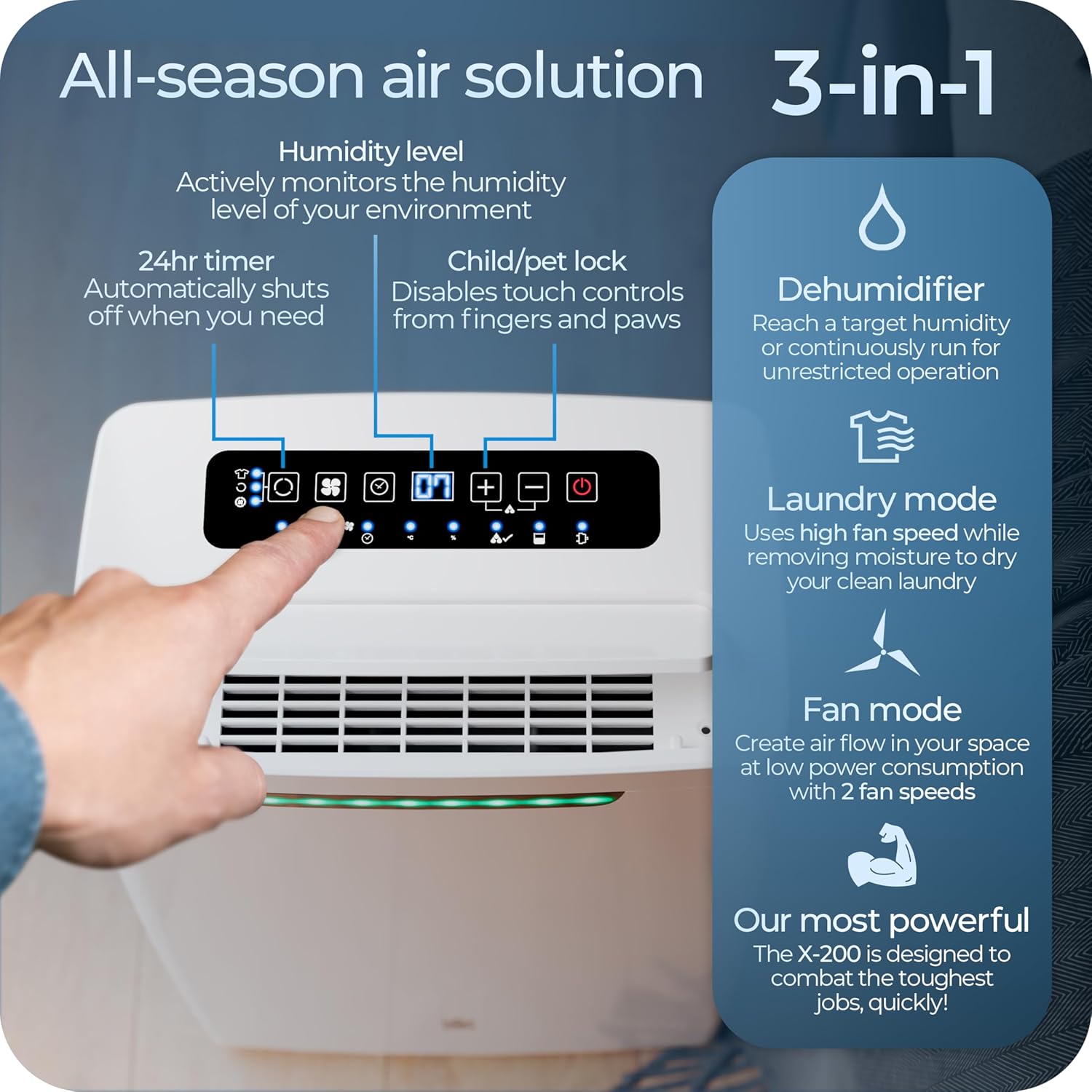 - SMARTER DESIGN – Efficiency is at the core of the X-200, using just 0.32kW/h Aero-Dynamic technology quietly captures moisture at just 48dB using CFC-free environmentally safe R290 gas. Operating down to 16°C with large 5.5L removeable water tank plus fan, timer, and clothes drying quick functions, this feature rich performer is useful all-year-round. An easy touch control let you easily set the target humidity which is constantly and automatically monitored