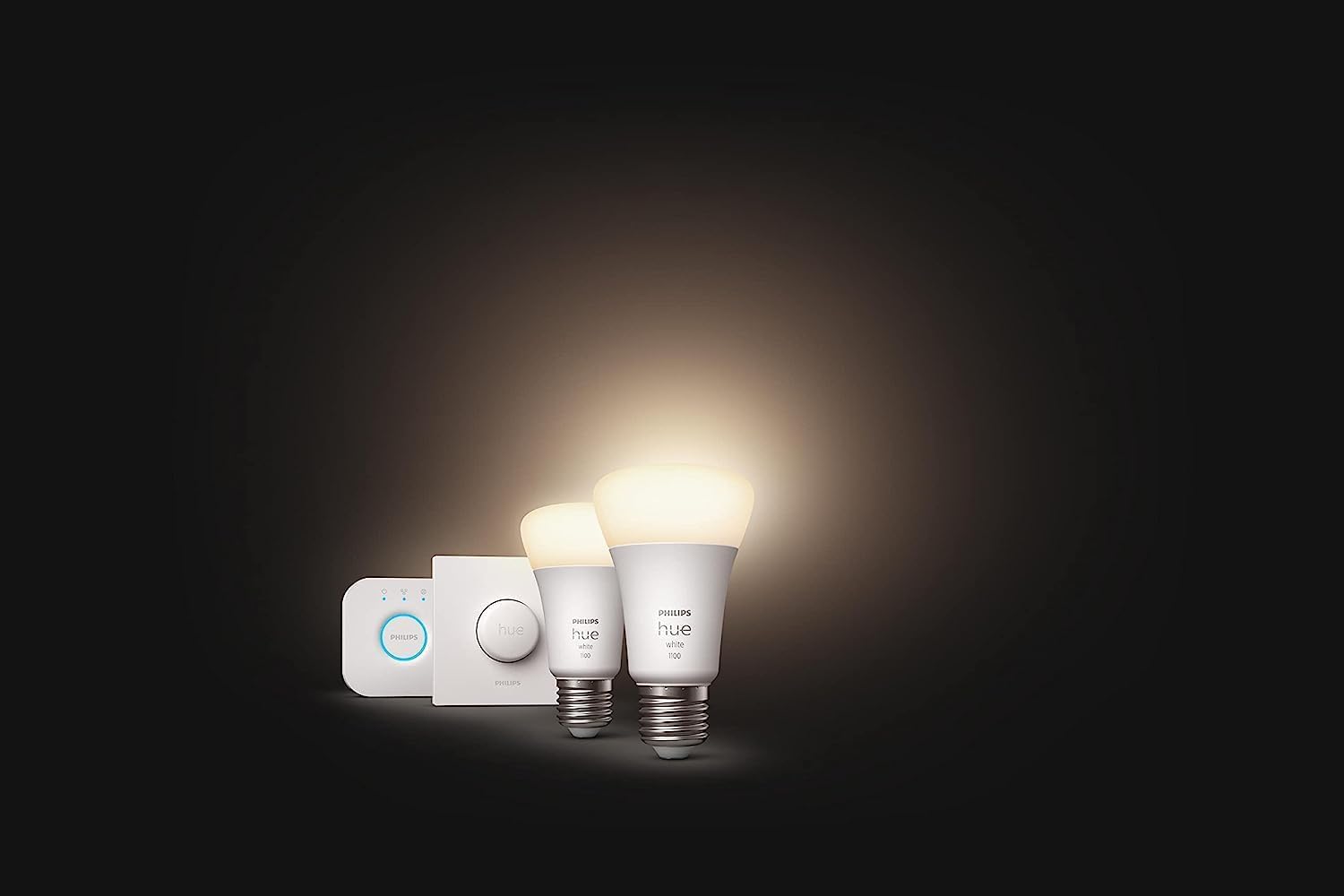 Philips Hue White Smart Light Bulb Starter Kit [E27 Edison Screw] – 2 Pack with Smart Button, Bluetooth & App Control, Voice Control via Alexa, Google Assistant, Apple HomeKit, Dimmable Brightness for Living Rooms & Kitchens