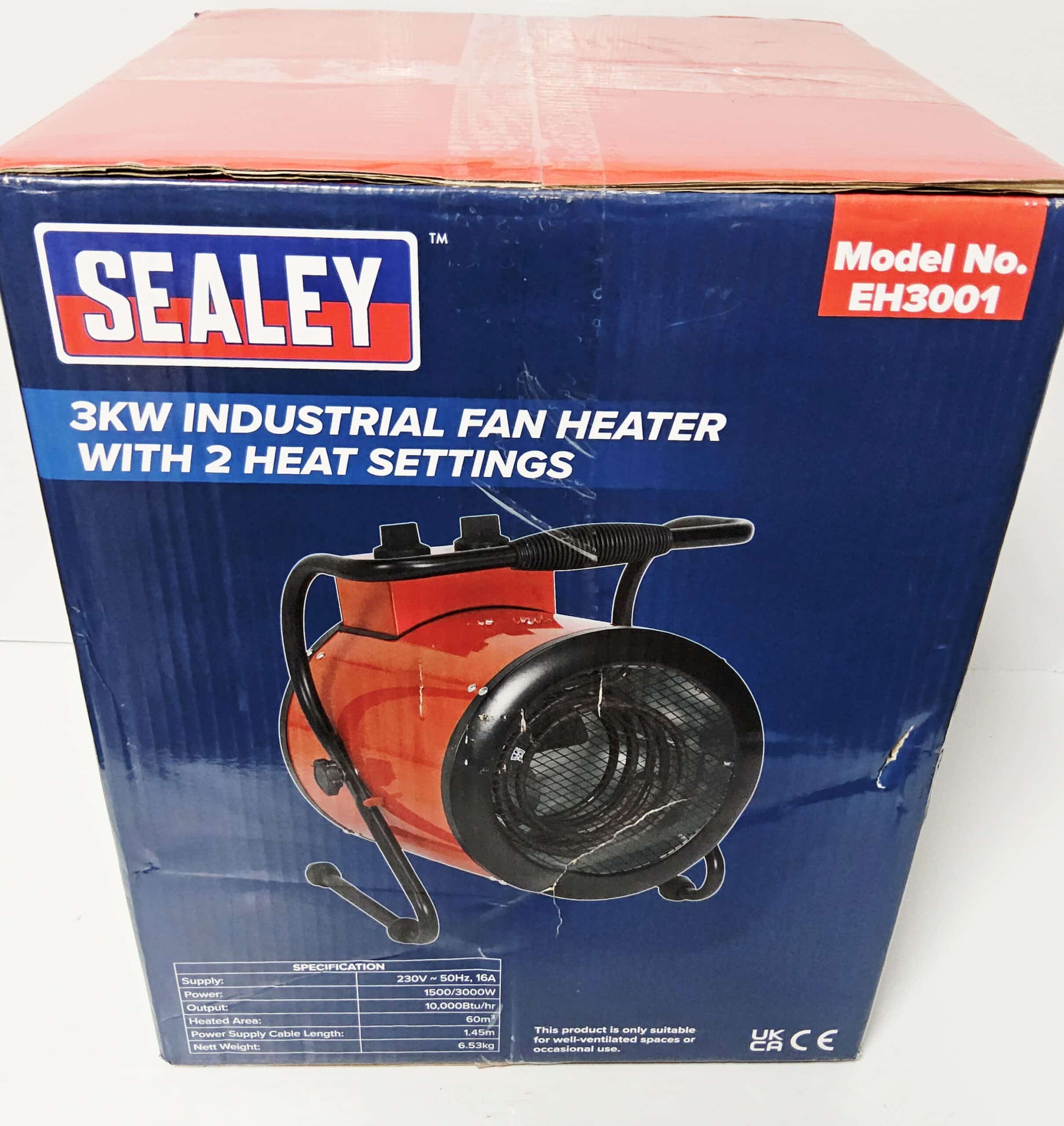 3 reviews for Sealey Industrial PTC Fan Heater 3 kW EH3001 – 2-Stage Thermostat-Controlled Workshop & Garage Heater, Portable, Dry Heat with Fan-Only Option, 10,000 BTU/hr, 230 V, 16 A, Durable Red Metal Build with Handle